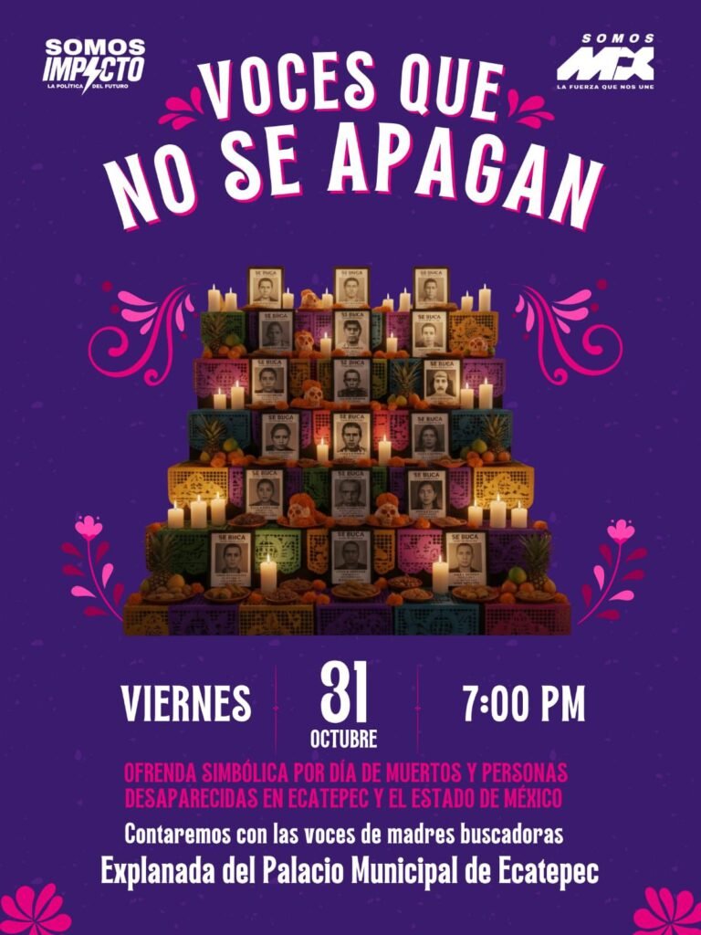 Como fuerza ciudadana identificada con las causas sociales, entre ellas la lucha de las Madres Buscadoras y familiares de más de 133 mil personas desaparecidas en México, Somos México (Somos MX) y las y los jóvenes de Somos Impacto colocaron una ofrenda simbólica por el Día de Todos los Santos, también conocido como Día de Muertos, en la explanada de la Alcaldía de Ecatepec de Morelos, Estado de México.